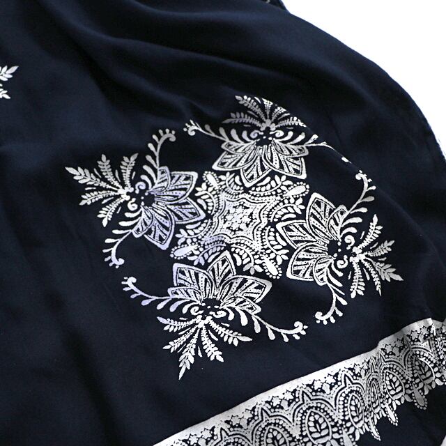 フロントはジグザグ柄のストライプ、バックはネイビーボディにダマスク柄がプリントされた手の込んだデザインです。