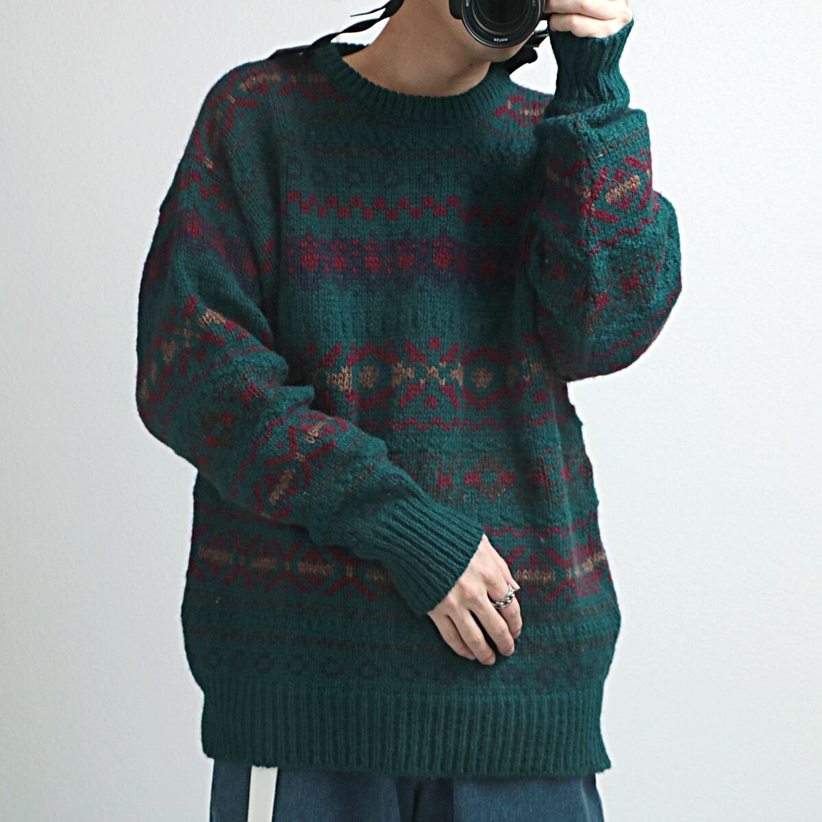 ダークグリーンのボディに同じトーンのフェアアイルを編み柄で表現された上品な仕上がりです。