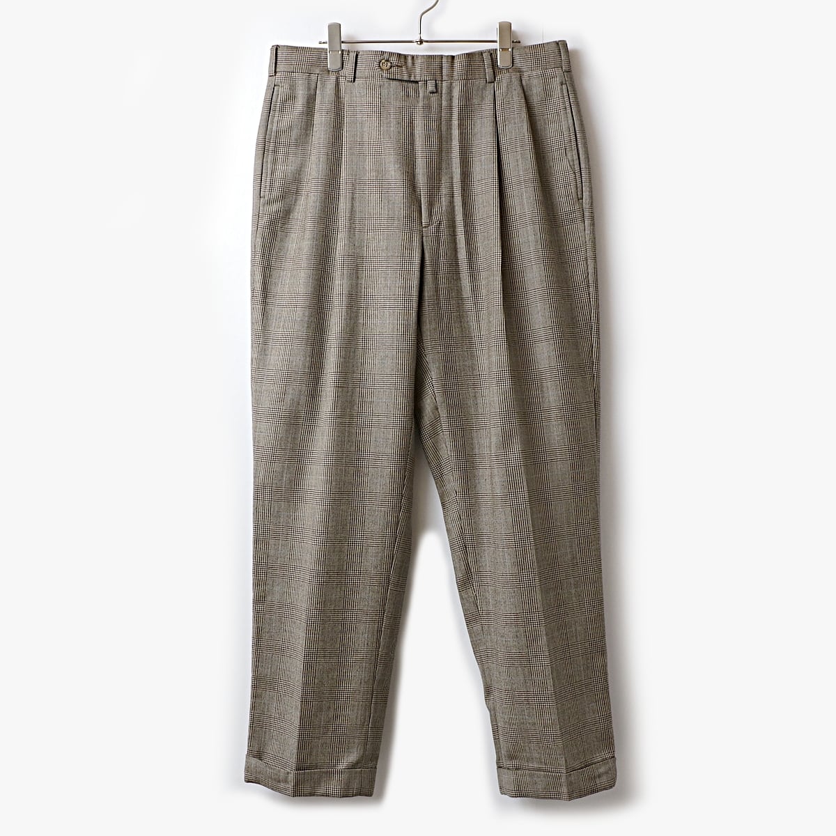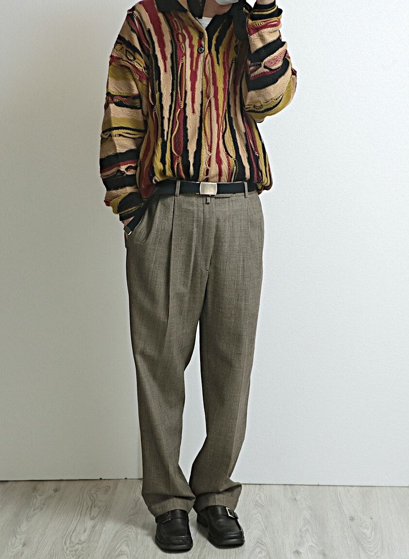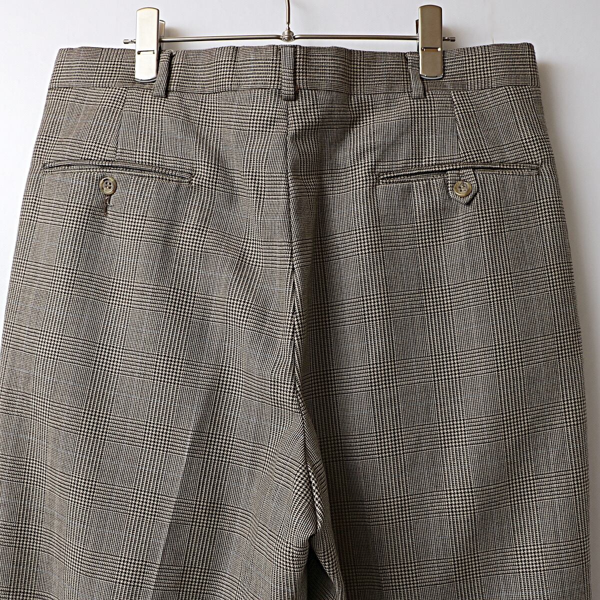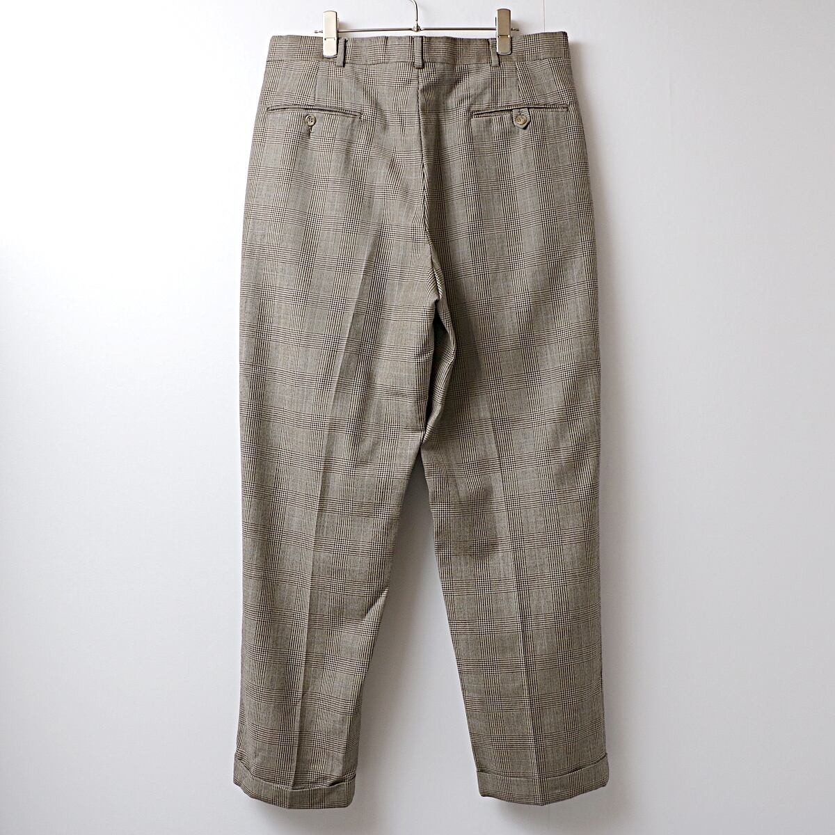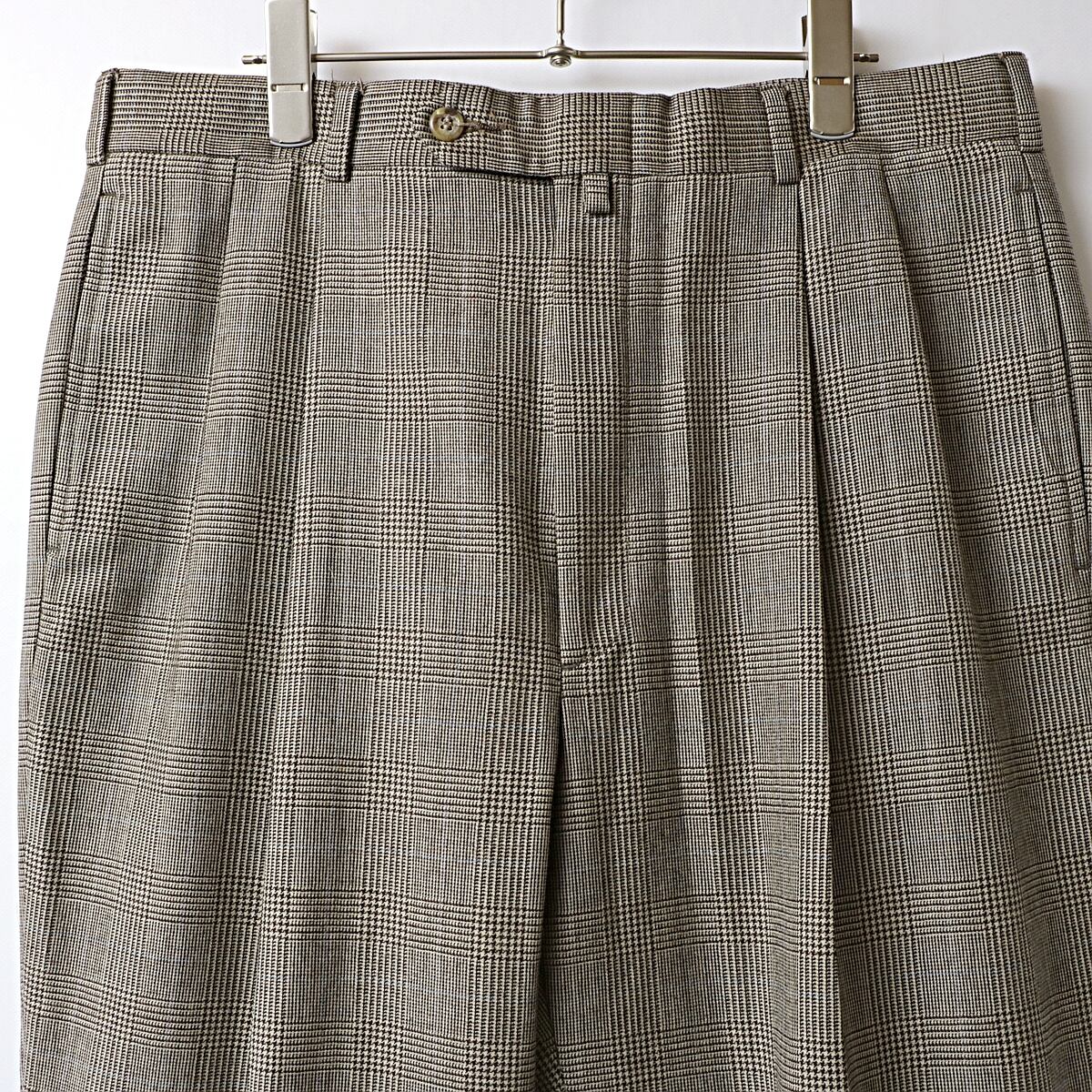 ボディは品質タグが欠損していますが、恐らくウール地のグレンチェック(千鳥)柄の2タック、裾ダブル仕立てのスラックス。