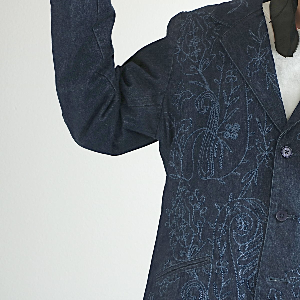 見頃にはボタニカルな刺繍が施され、デニムジャケットですと、ワークテイストのイメージが多いですが、ドレスよりに使えそうです。