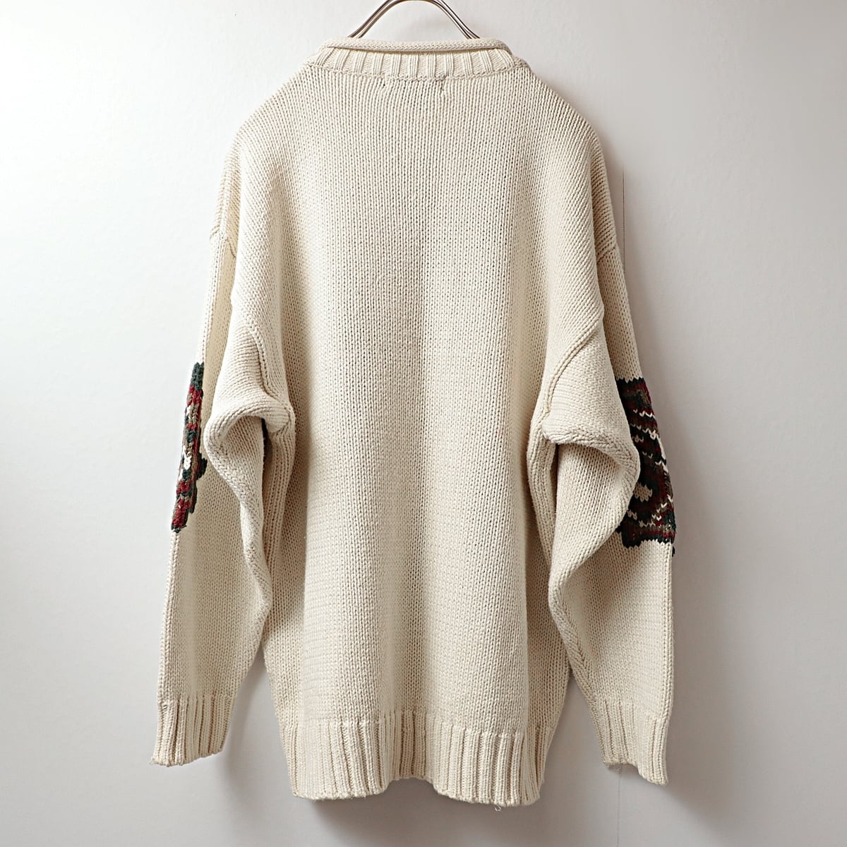 生成り色をベースに、部分的に大判なペイズリー模様を織り、ギュッと詰まった首回りのロールネックが良いアクセントになり良い雰囲気です。