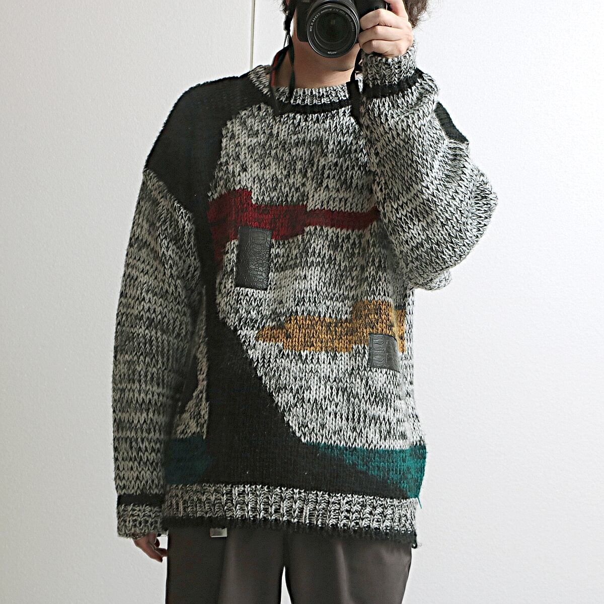 モノトーンべースにランダムに配色されたマルチカラーとフェイクレザーをパッチした90sらしいアクリルニット。