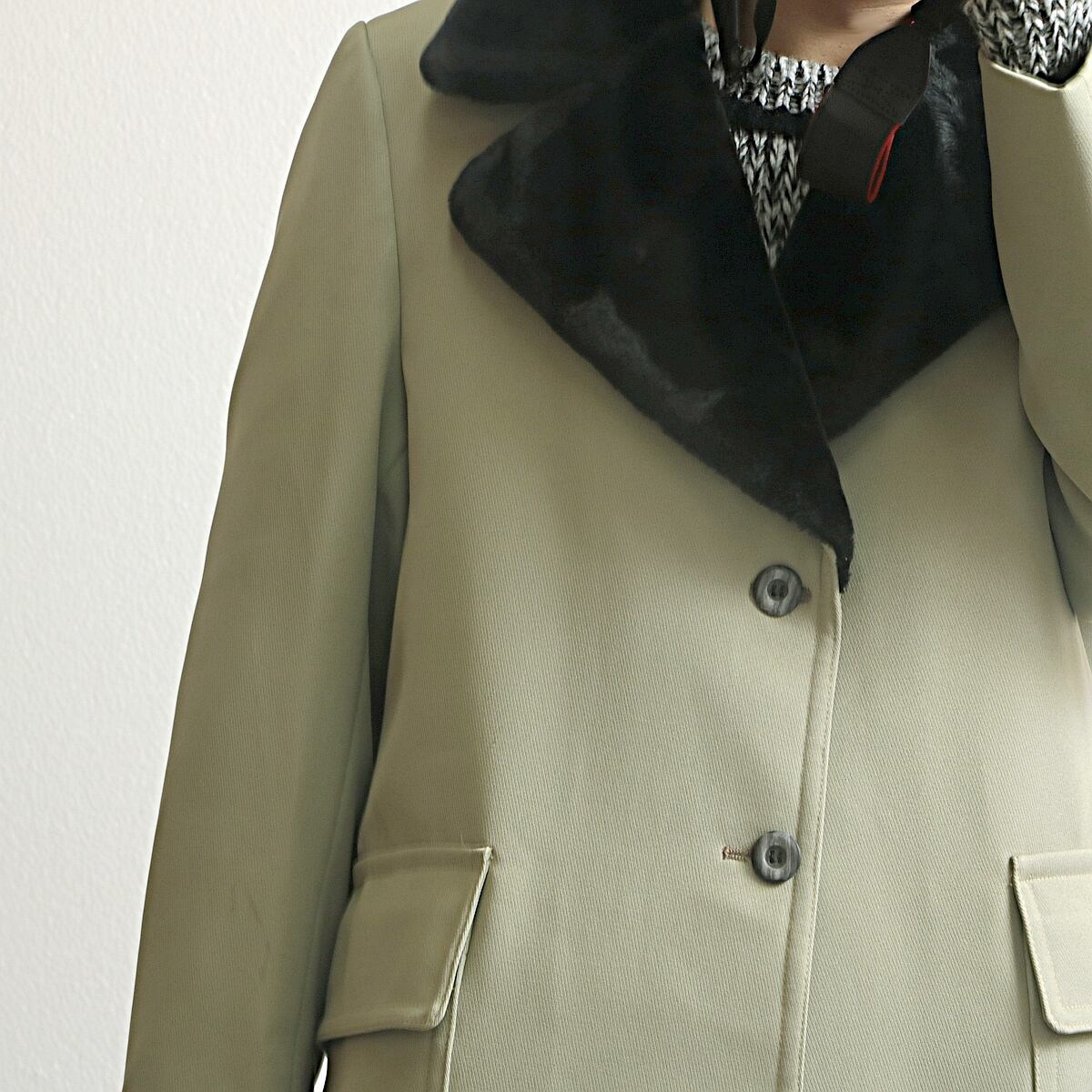首を大きく覆うようなショールカラーのボアが特徴の通称ギャングコート。