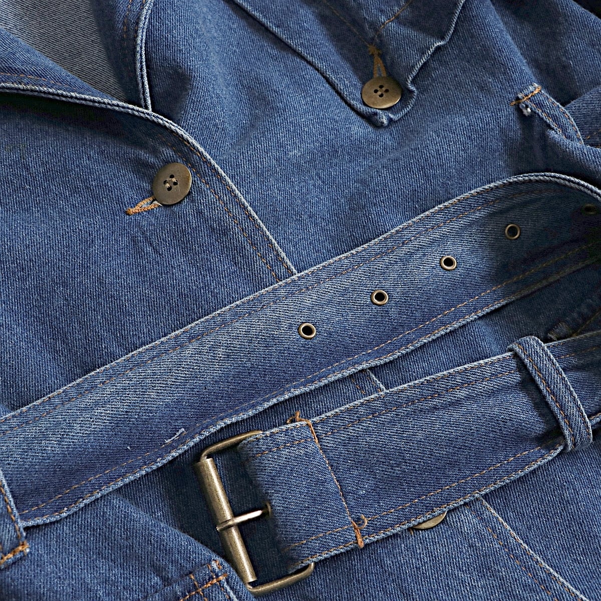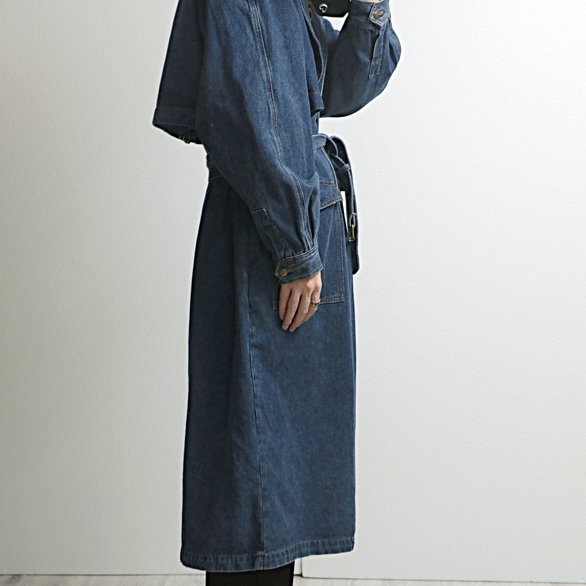 コットン100%のヘヴィウェイトなブルーデニムを使ったデザイン性高いシングルトレンチコート。
