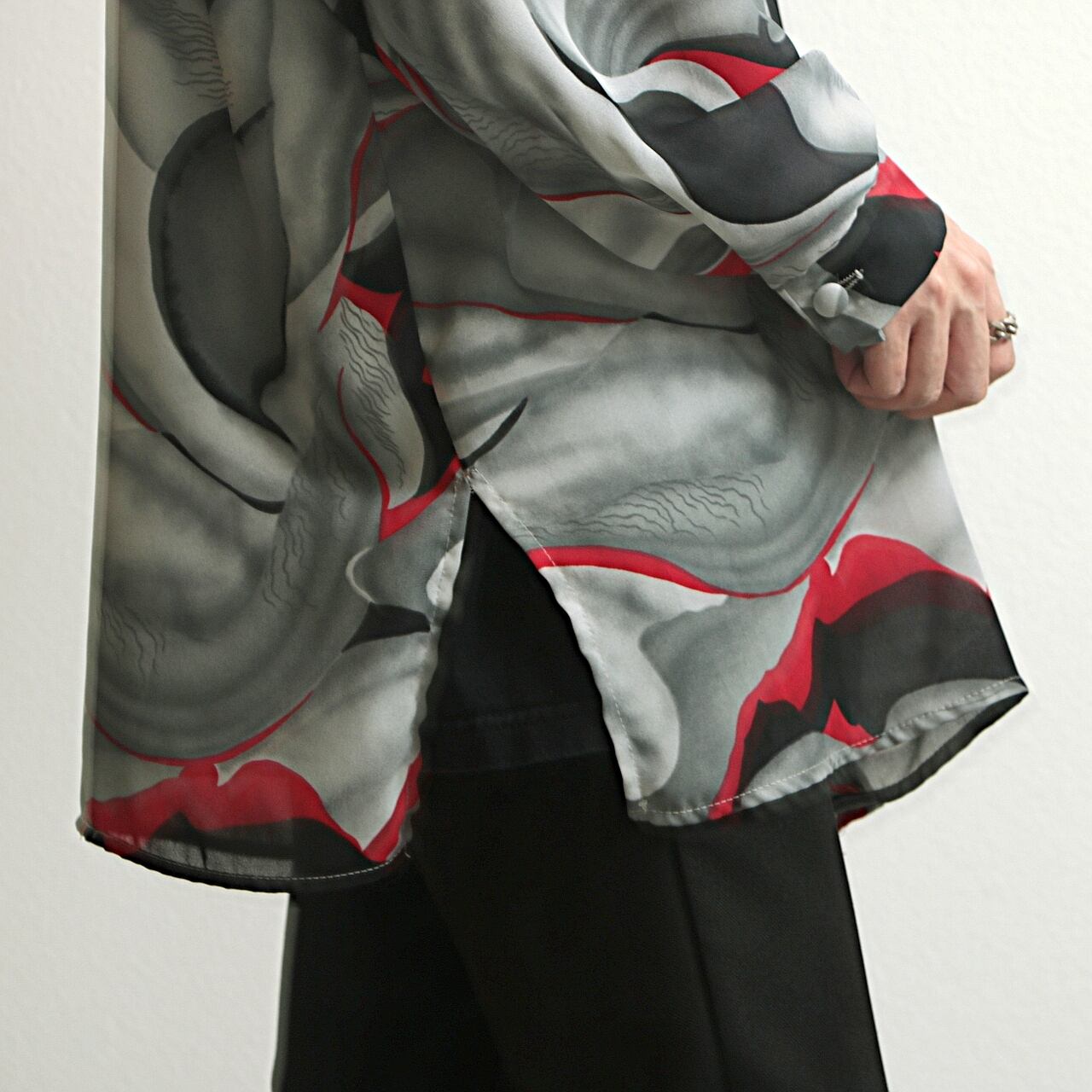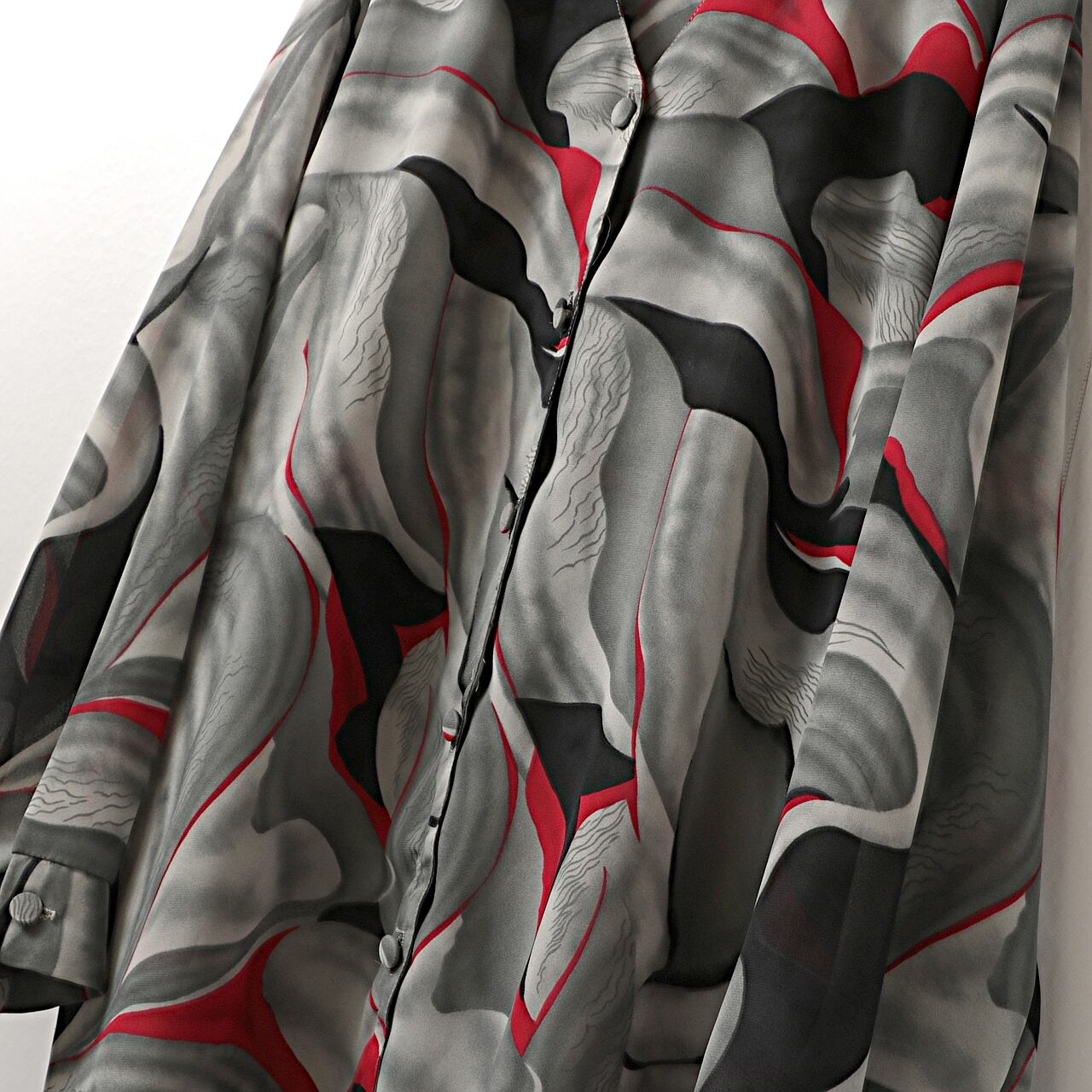 ポリエステル地で作られたエアリー感あるボディで、水墨画のようなマーブル柄が存在感を放つ総柄パターン。