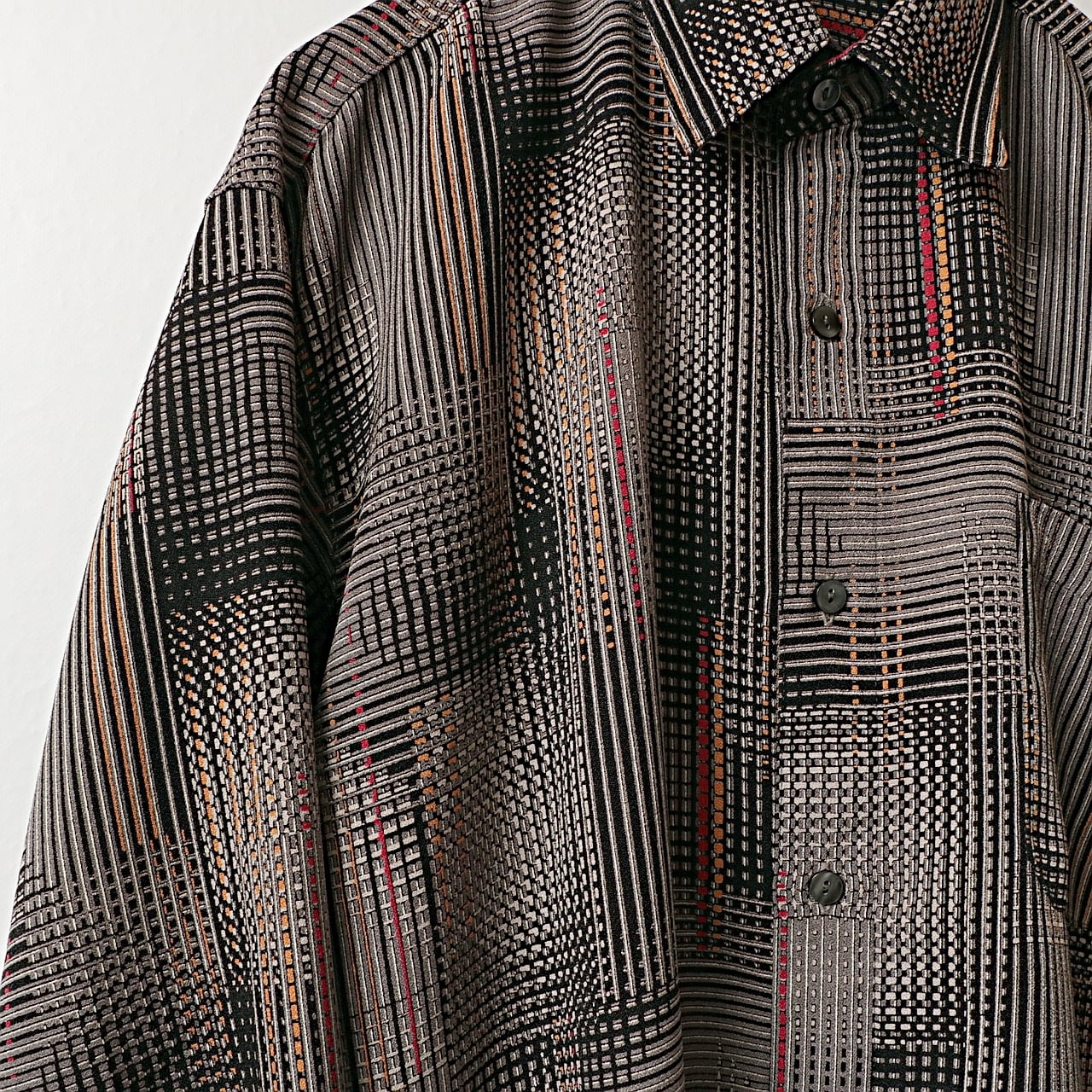 モノトーンベースと色使いによる陰影で奥行が出されて雰囲気をよりグッと出してくれる幾何学模様のフルパターンシャツ。