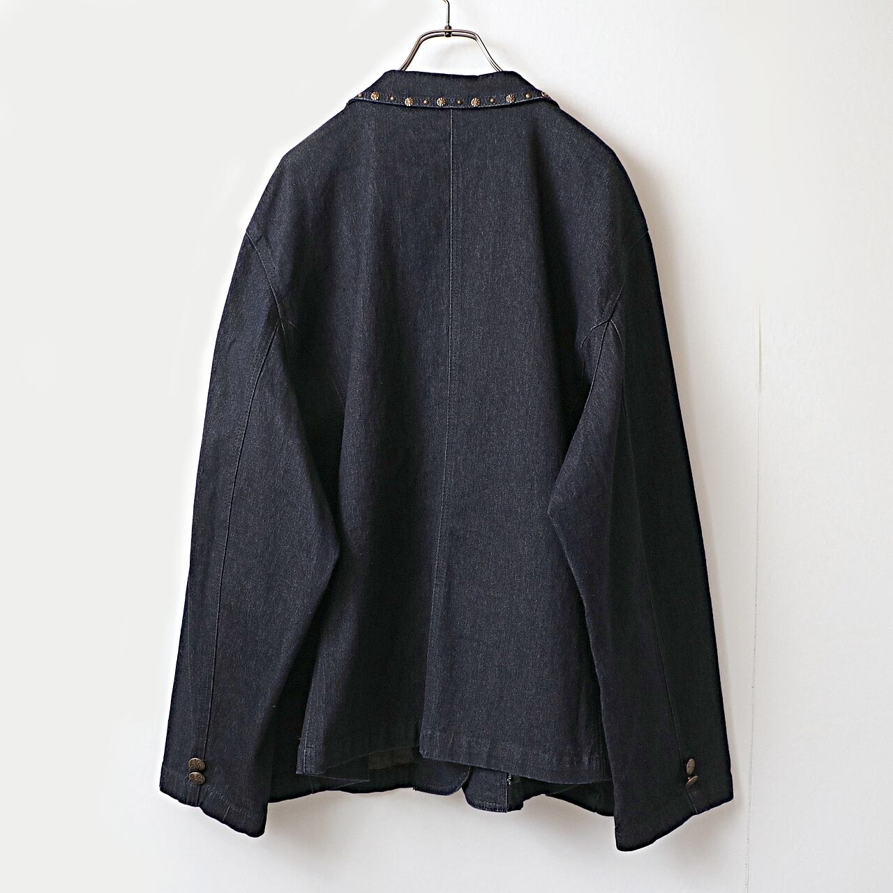 濃紺デニムのテーラードジャケットに際立つスタッズ。